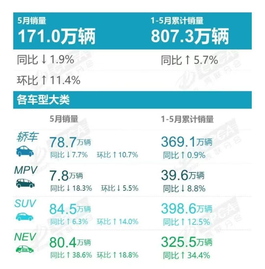 据中国汽车运动协会乘联会最新零卖销量数据统计,5月份国内狭义乘用车商场零卖销量达171.0万辆,同比下降1.9%,环比增长11.4%;1-5月份累计销量807.3万辆,同比增长5.7%。各车型大类中,5月份轿车销量为78.7万辆,同比下降7.7%,环比高潮10.7%;MPV销量为7.8万辆,同比下降18.3%,环比下降5.5%;SUV销量为84.5万辆,同比高潮6.3%,环比高潮14%;新动力车销量为80.4万辆,同比高潮38.6%,环比高潮18.8%。不错看出,除了MPV外,其他几个细分商场均比4月份有所升温。