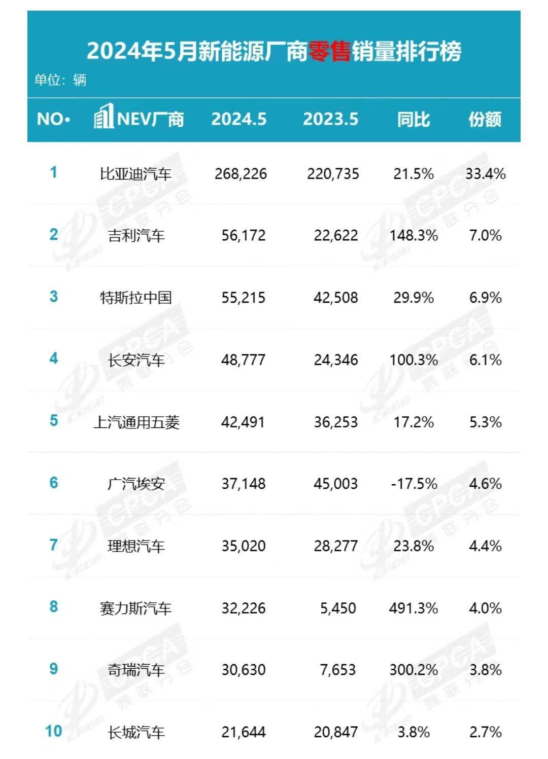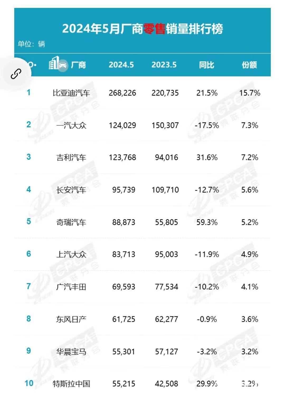 比亚迪上月不仅链接保抓领跑,并且1-5月国内累计销量率先唐突100万辆。5月份,零卖销量排在第二、三位的一汽公共、祯祥汽车均达到了12万台,但还不到销冠比亚迪的一半。在TOP10几个自主品牌头部车企中,与比亚迪、祯祥、奇瑞分裂同比增长21%、31.6%、59.3%比拟,长安汽车上月销量同比下滑两位数,显得有些耀眼。