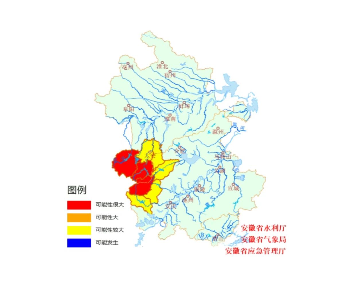 安庆市岳西县,六安市金寨县、霍山县发生山洪灾害可能性很大(Ⅰ级,红色预警);