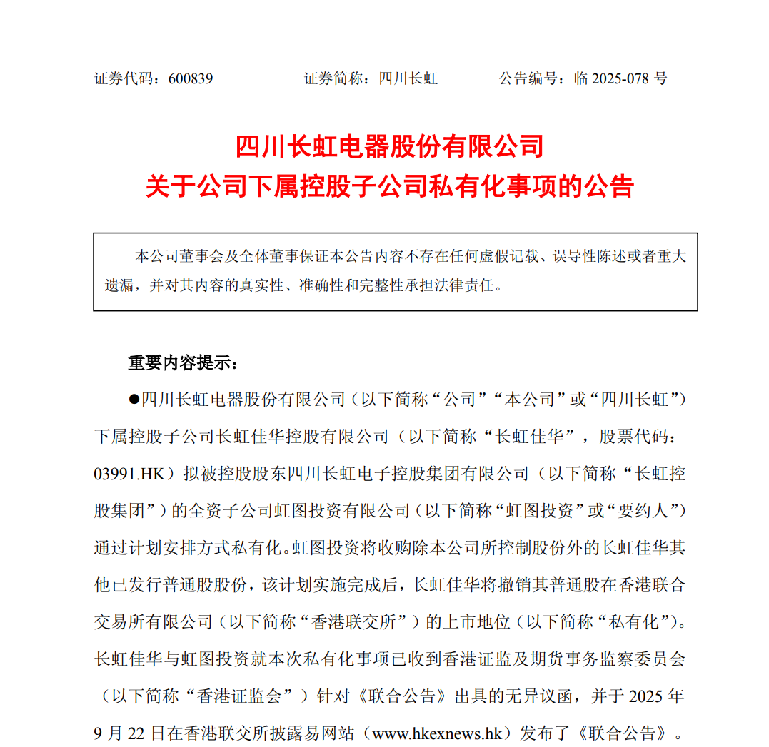 四川长虹(600839)(600839)9月22日晚间发布公告称,公司下属控股子公司长虹佳华(股票代码:03991.HK)拟被控股激动长虹控股集团的全资子公司虹图投资通过计算安排形状荒谬化。虹图投资将收购除四川长虹所限制股份外的长虹佳华其他已刊行平凡股股份,该计算实行完成后,长虹佳华将取销其平凡股在香港联交所的上市地位。